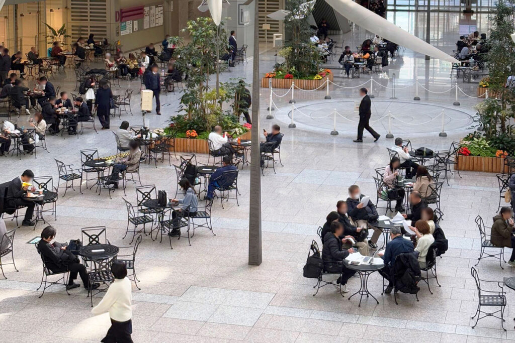 僕は朝8時半頃の出社なのですが、朝食がとれない日など、コンビニで買った軽食をTFTビルのフリースペースで食べてから出勤できるのが便利。隣のビルに「カフェ・ベローチェ」もあるのでコーヒー片手に出社する人も多いです。