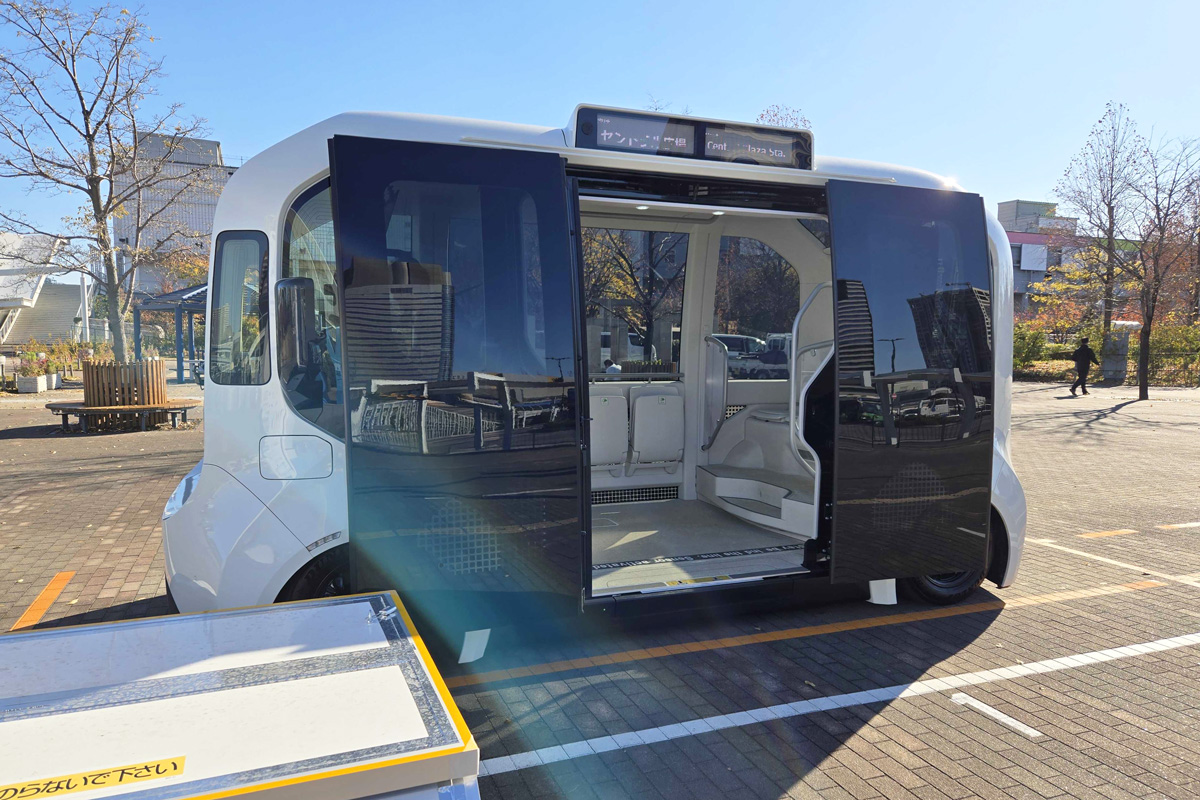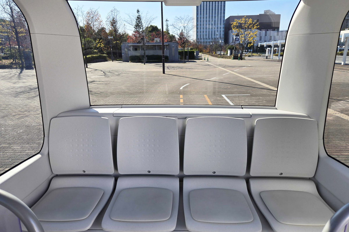 東京テレポート駅前からセントラル広場に向かうルートに乗車してみました。車体の色味は都市空間にも溶け込みやすい白と黒、やや丸みを帯びたフォルムと、アイコンタクトのように点滅する丸型のフロントランプが親しみやすさを与えてくれます。