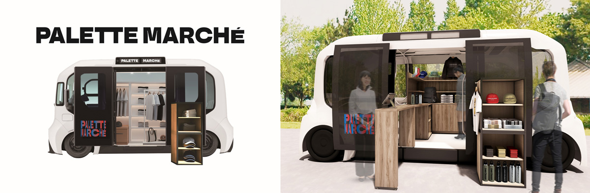 運行車両の「e-Palette」は、「Move for All(すべての人に移動と感動を)」をコンセプトにトヨタが開発した次世代モビリティ。最大の特徴は、タイヤを四隅に配置し、床をフラットにしたことで、室内空間が広々としていること。一台で“輸送サービス”も“移動型店舗”も可能なマルチなモビリティです。